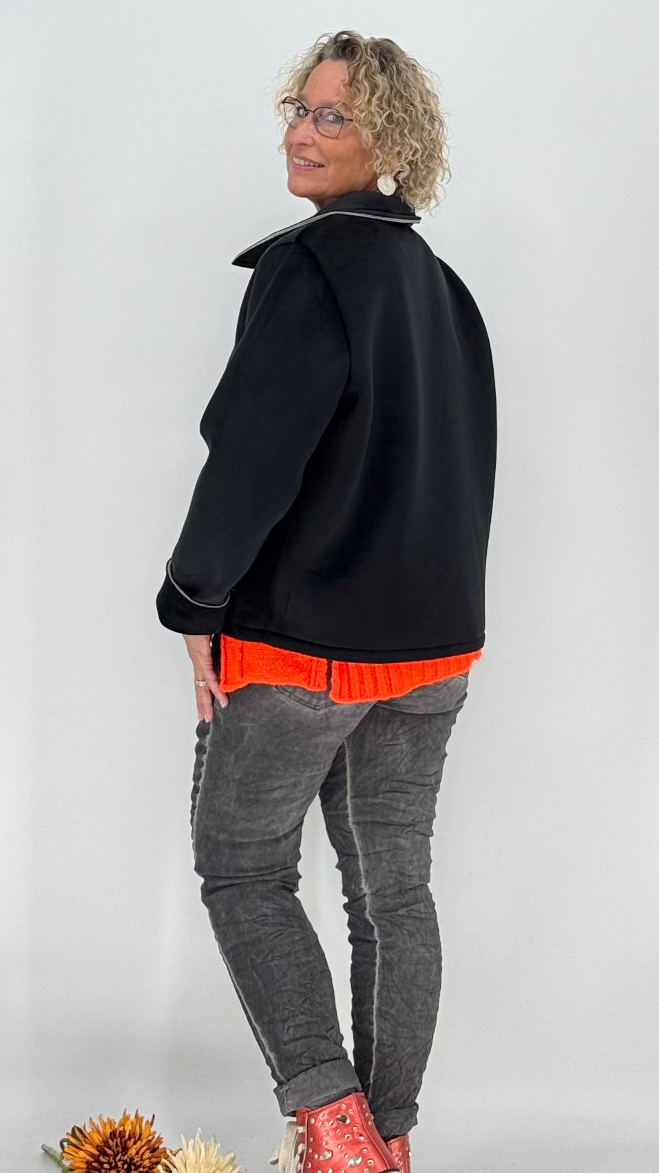 Stylische Jacke. Die offene Schnittführung und die markanten Revers machen sie zu einem echten Blickfang. Leicht bequem und vielseitig kombinierbar - perfekt für moderne, selbstbewusste Outfits.