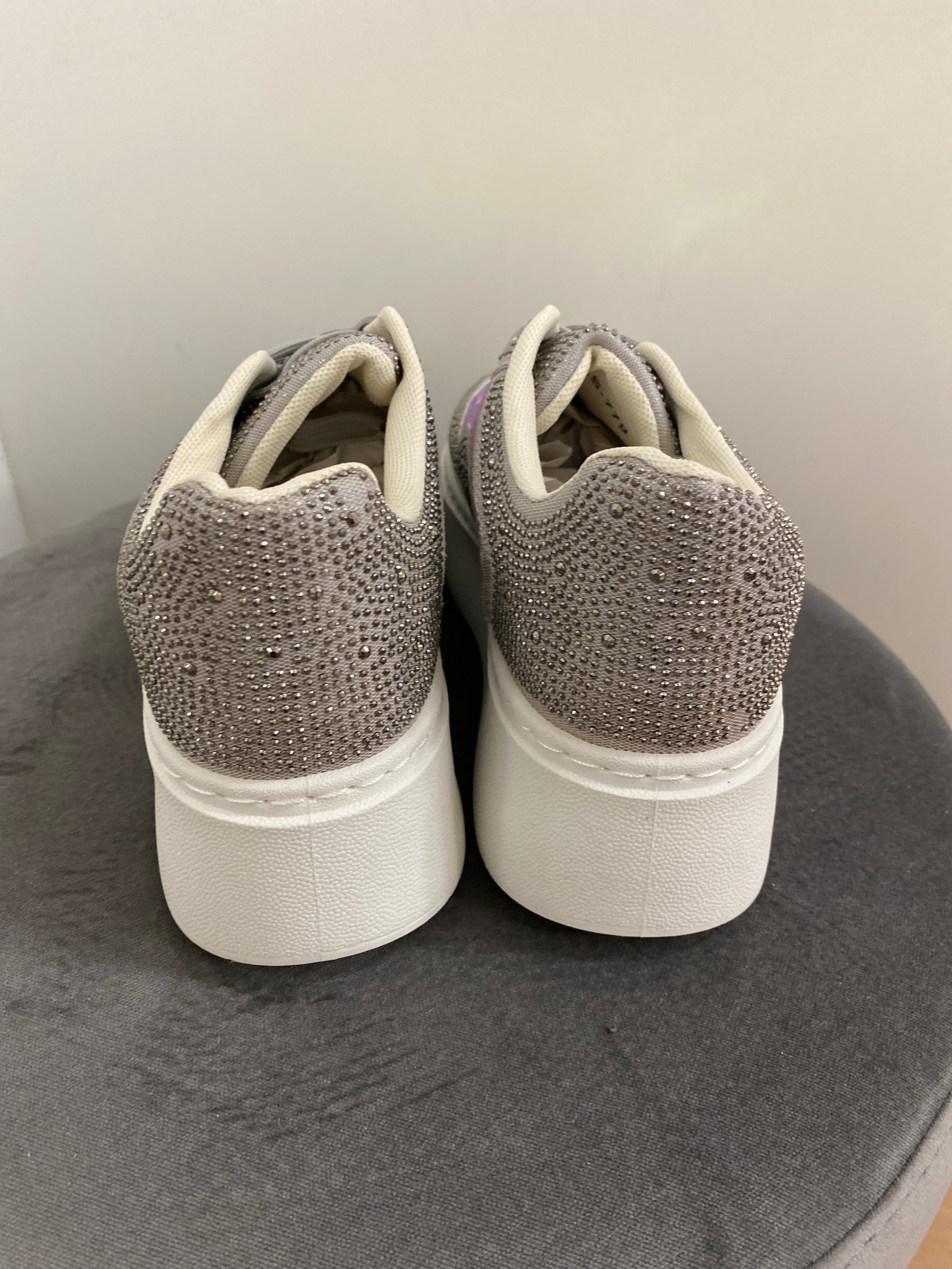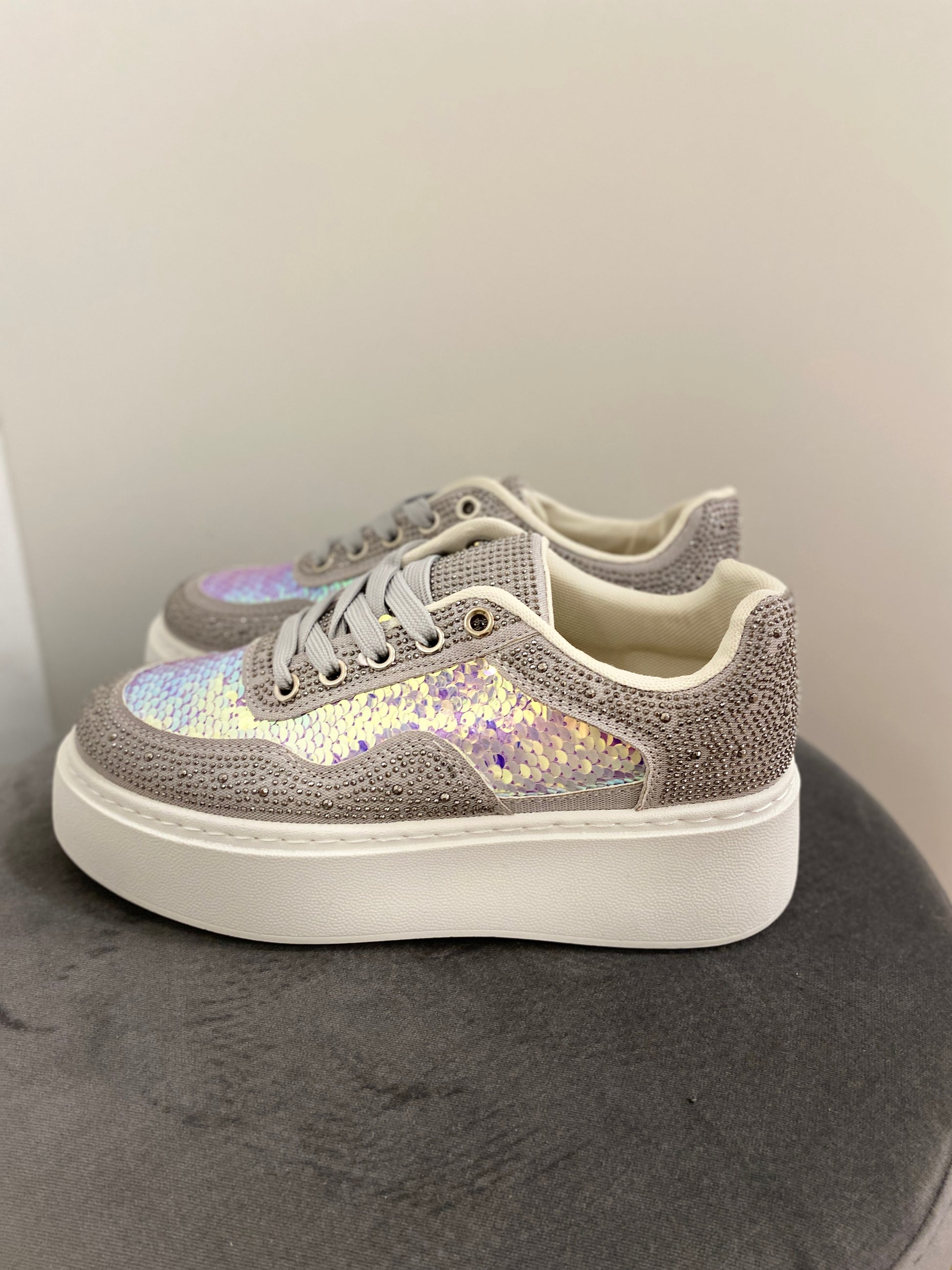 Erleben Sie einen Hauch von Luxus mit unseren "Shine" Sneakern in elegantem Grau. Die auffälligen Pailletten verleihen Ihrem Style das gewisse Etwas. Mit Details in Platinausführung sind diese Schuhe ein echter Hingucker. Entdecken Sie jetzt diese ausgefallene Kombination aus Sneaker und Eleganz.