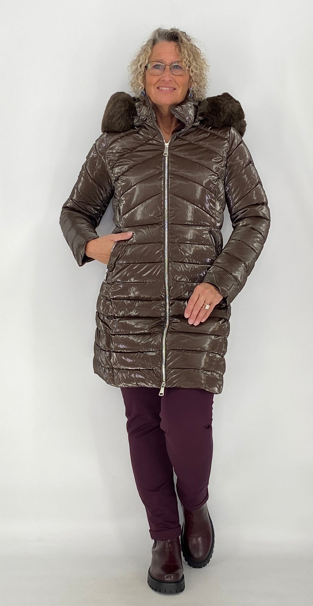 Steppmantel in Champagner- und Braun -Ton- edel glänzend und superleicht! Dieser warme, figurumspiegelte Mantel besticht durch seine elegante Optik mit schimmernder Oberfläche und abnehmbarer Kapuze mit kuscheligem Fellbesatz. Zwei Reißverschlusstaschen, Zwei-Wege-Zipper und ein angenehmes Innenfutter machten ihn zum perfekten Begleiter für die kalte Tage.