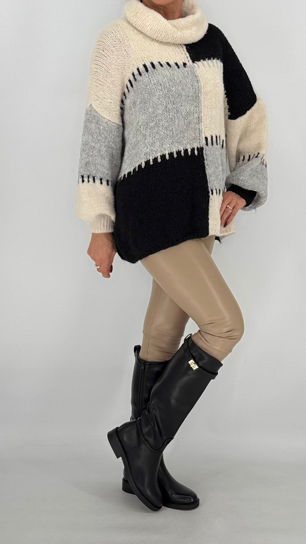 Dieser kuschelige Strickpullover verbindet Komfort und Stil. In einem Farbblock-Muster, dass sich leicht zu vielen Farben kombinieren lässt. Der grob gestrickte Rollkragen sorgt für extra Kuschelfaktor und hält dich warm.