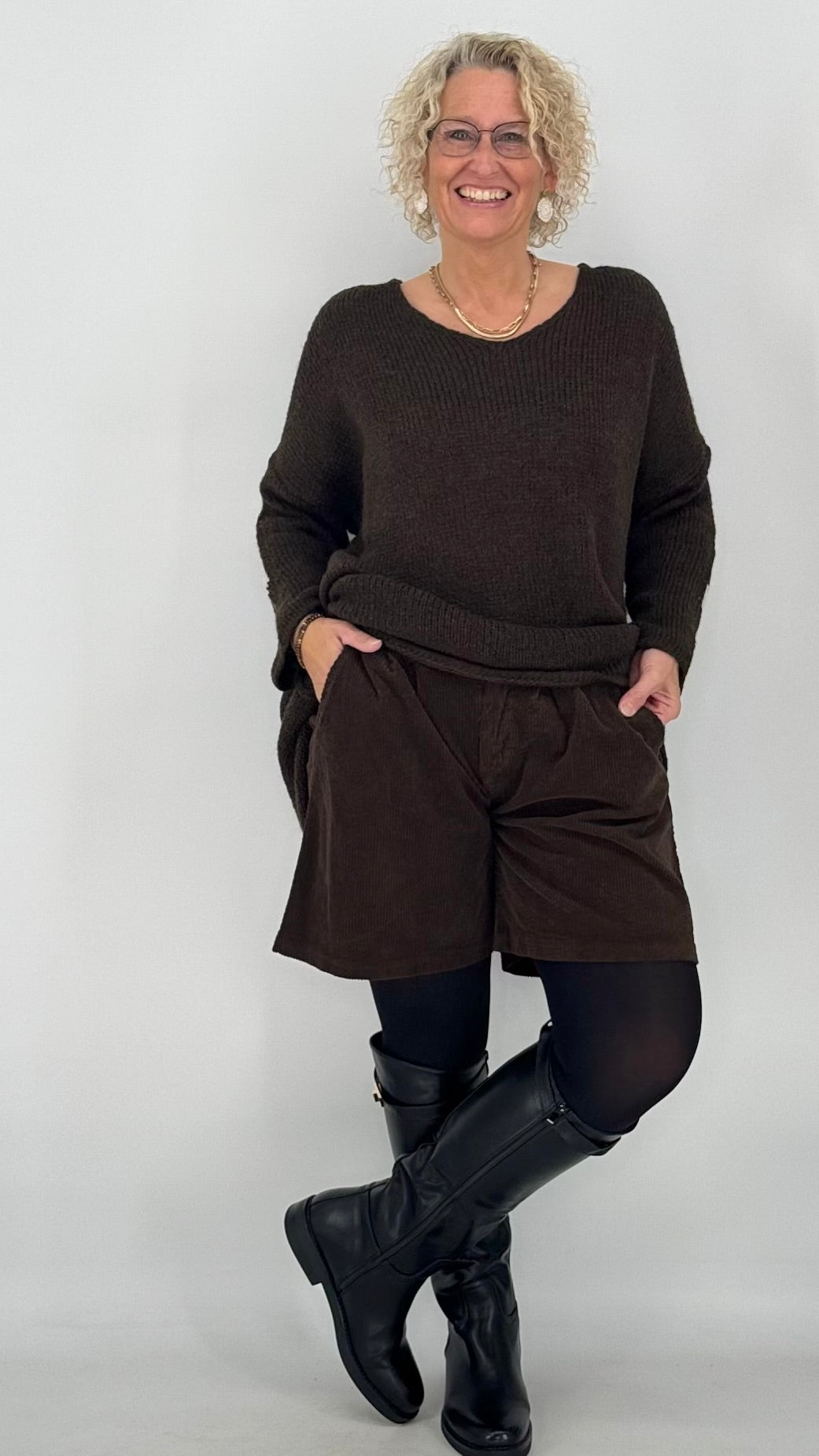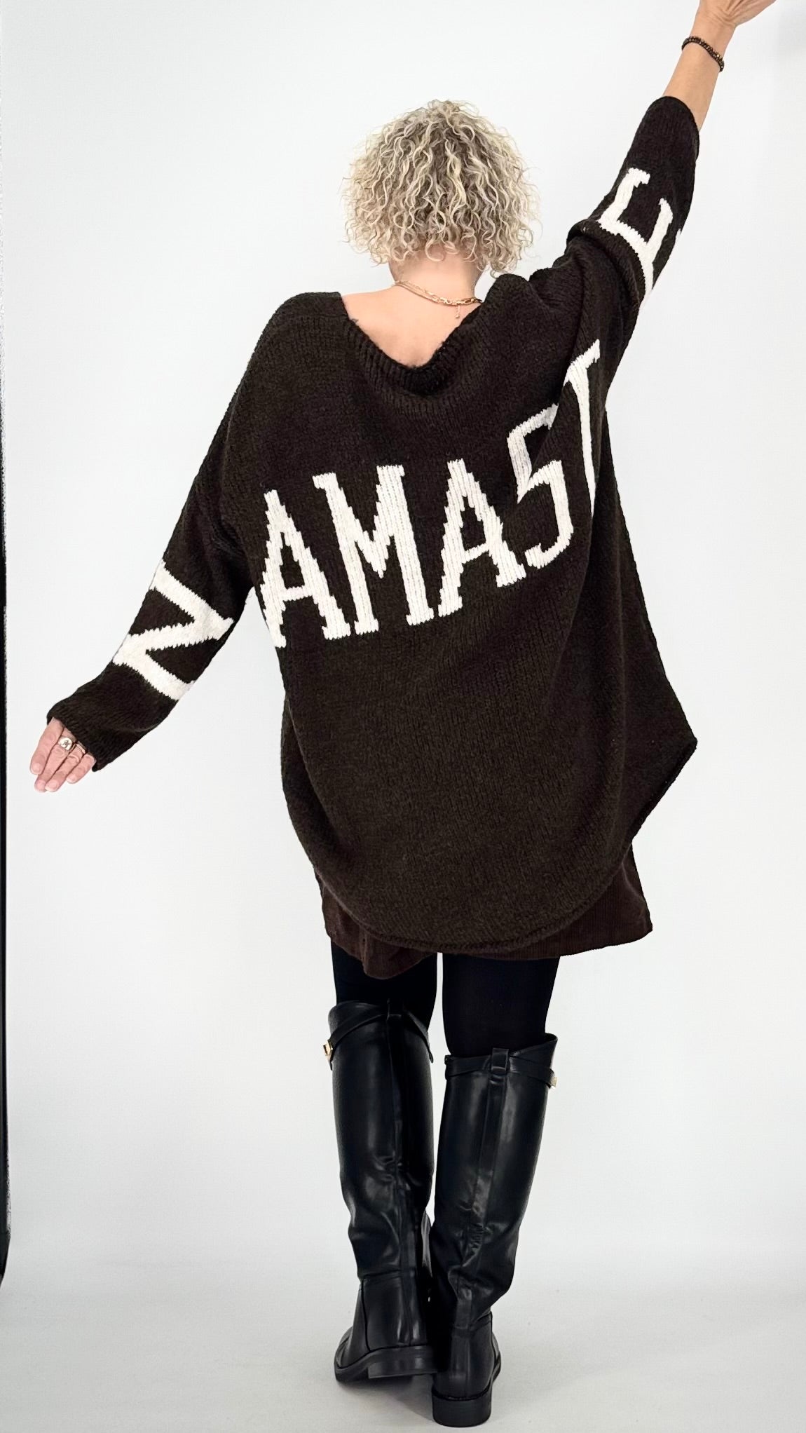 Diese Strickpullover verbinden Komfort und Stil. Eine Strickpullover mit Schriftzug "Namaste" und V-Ausschnitt. Ob zu Rock oder Jeans – dieser Pullover verleiht jedem Outfit eine elegante, gemütliche Note.